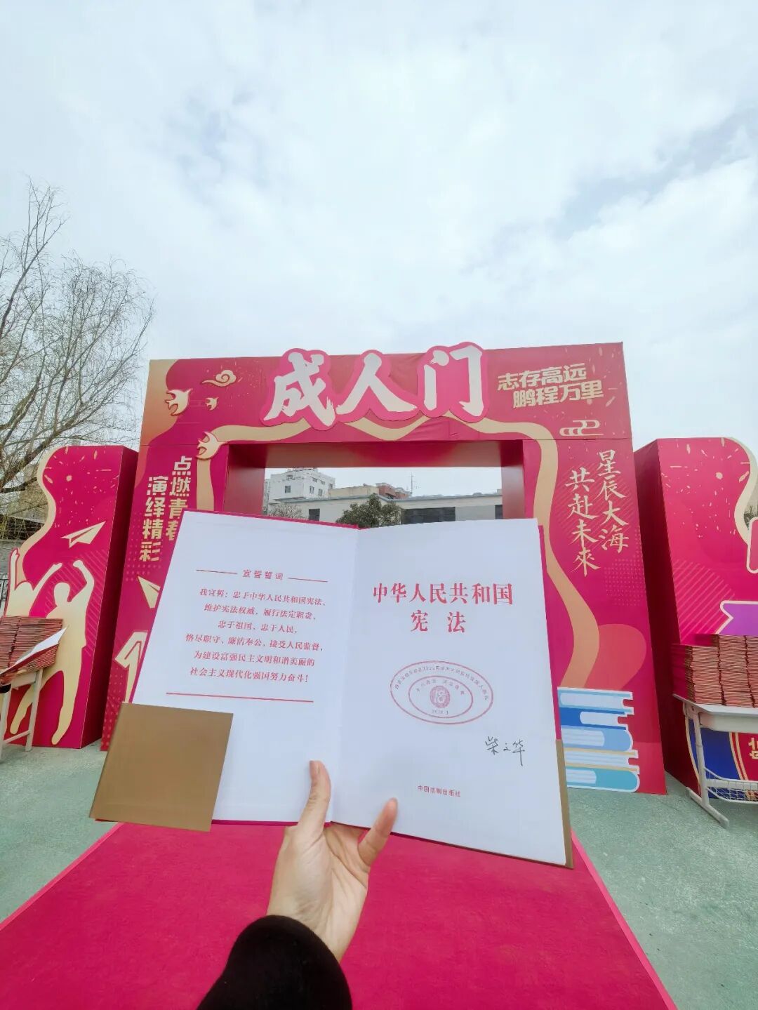 从校领导们手中接过宪法,这不仅是跨越成长的门槛,更是迈向责任与担当的崭新起点。那一刻,爱国、感恩、梦想、坚强,所有美好的情感在心中升腾。