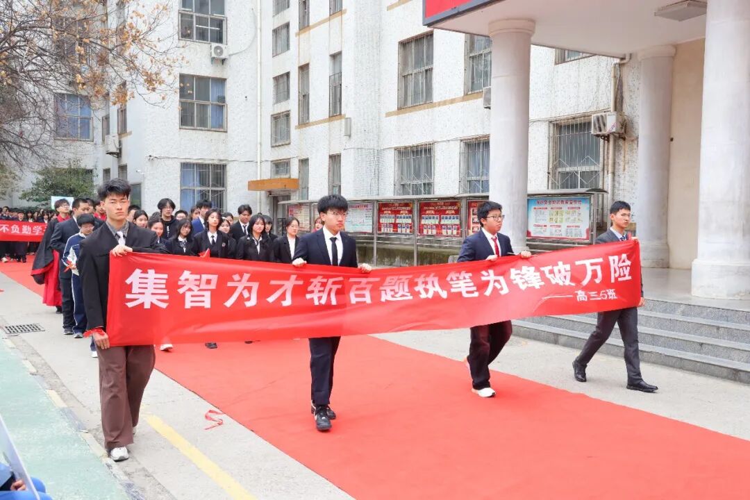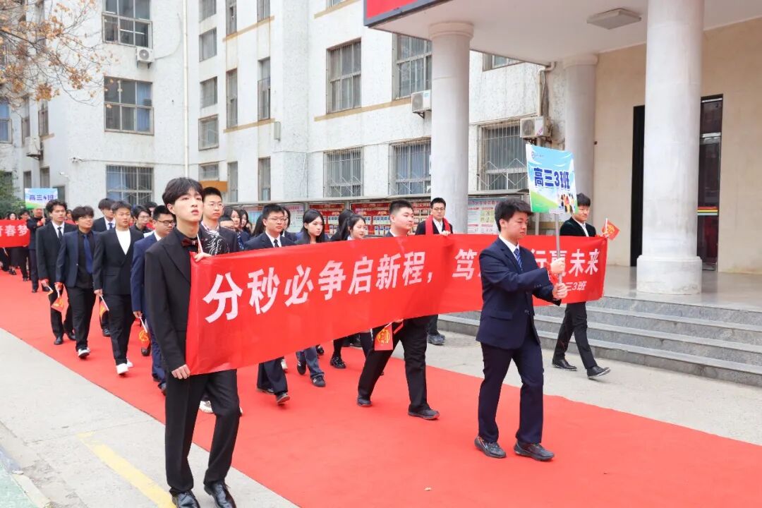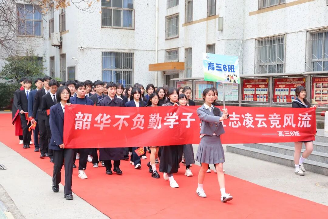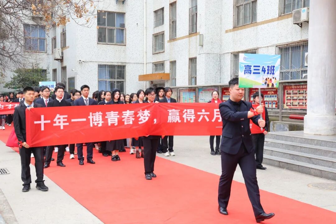 伴随着激昂的进行曲,高三学子方队迈着铿锵有力的步伐依次入场。他们目光如炬,步履铮铮,眼眸里藏着十八年求学路的点滴回忆——那些教室灯下的苦读、操场跑道的奔跑、同窗相伴的温暖,都化作此刻的从容与底气。十八岁的号角已经吹响,他们身披荣光,整装待发,只为在六月的苍穹下扶摇直上,金榜题名。