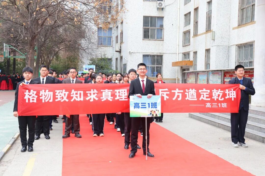 授旗仪式上,战旗猎猎,那是责任的传递,更是荣光的延续。校领导郑重地将一面面象征着胜利与希望的战旗,授予高三各班班主任。班主们任紧握战旗,挥舞之间,红旗如火焰般在风中翻涌。这一刻,旗帜的交接,不仅是信任的托付,更是军令状的签订;它承载着学校对学子们的殷切期盼,也凝聚着全体高三师生决胜高考、誓创辉煌的磅礴力量。
