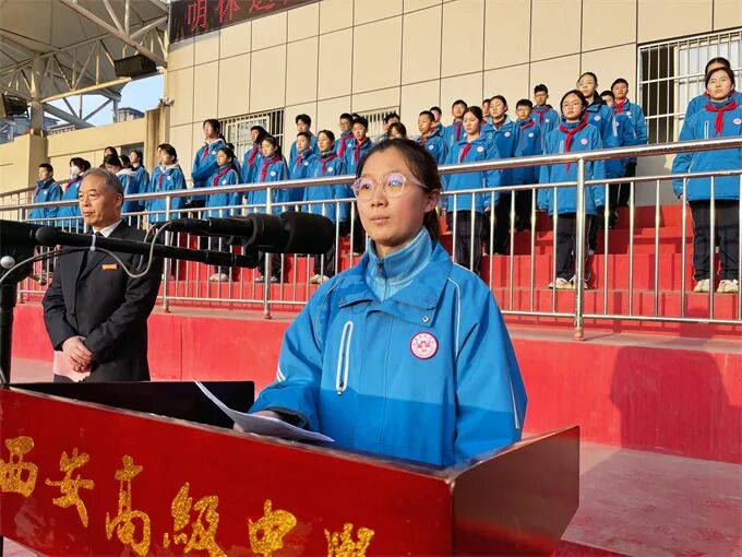 庄严的升旗仪式后,高二(3)班蓝天悦同学代表全体同学发言。她分享了自己对新学期的理解,号召同学们在新学期夯实基础、提升素养,以脚踏实地的态度迎接挑战。