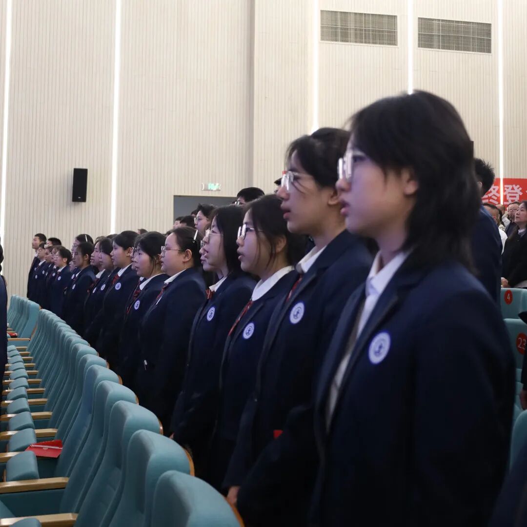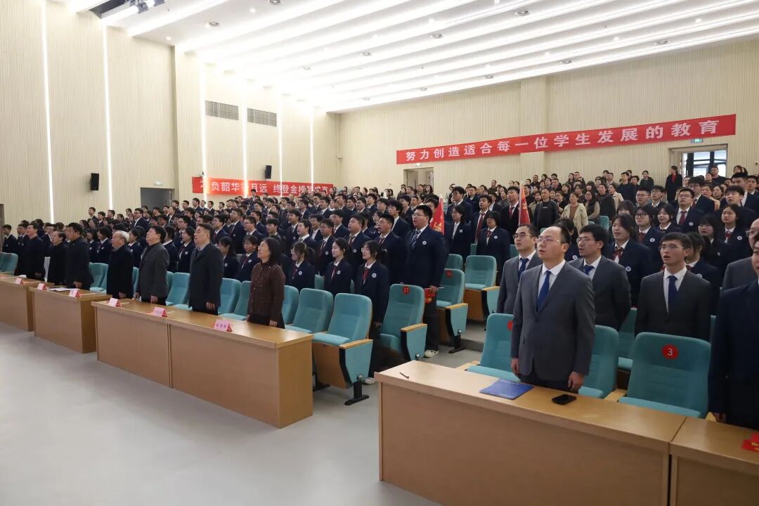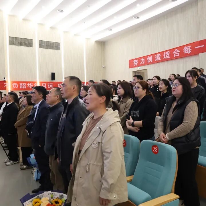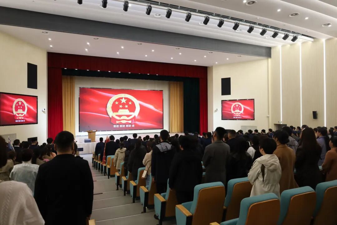 大会在庄严的国歌声中拉开帷幕。全体与会人员肃立,目光坚定,高唱国歌。