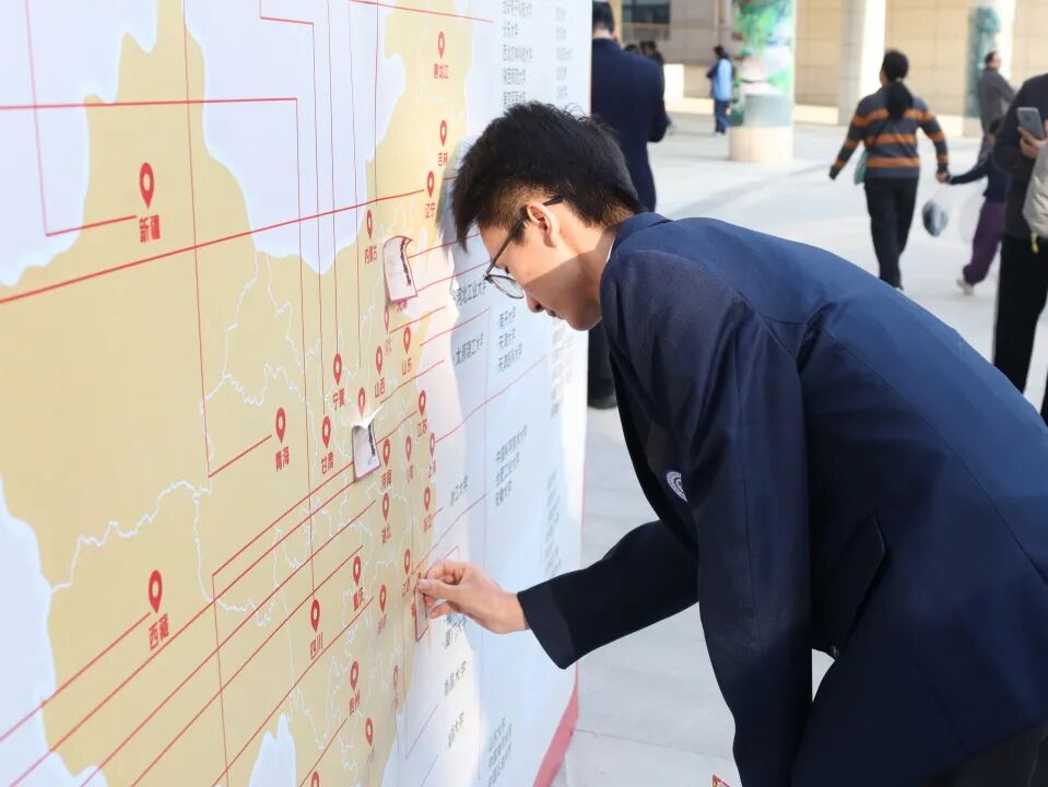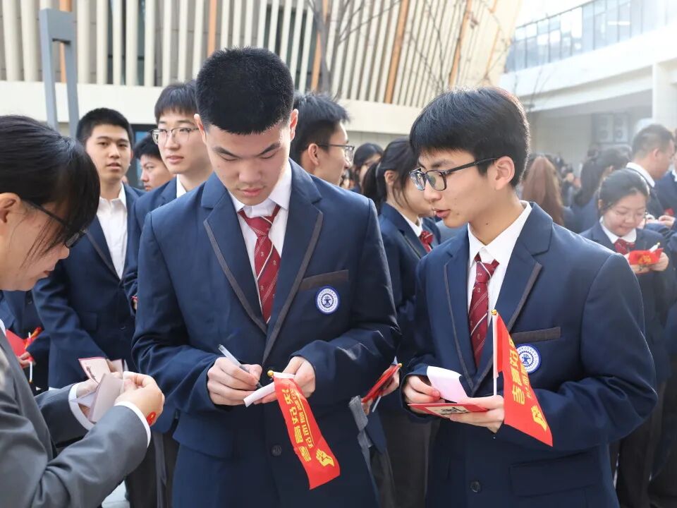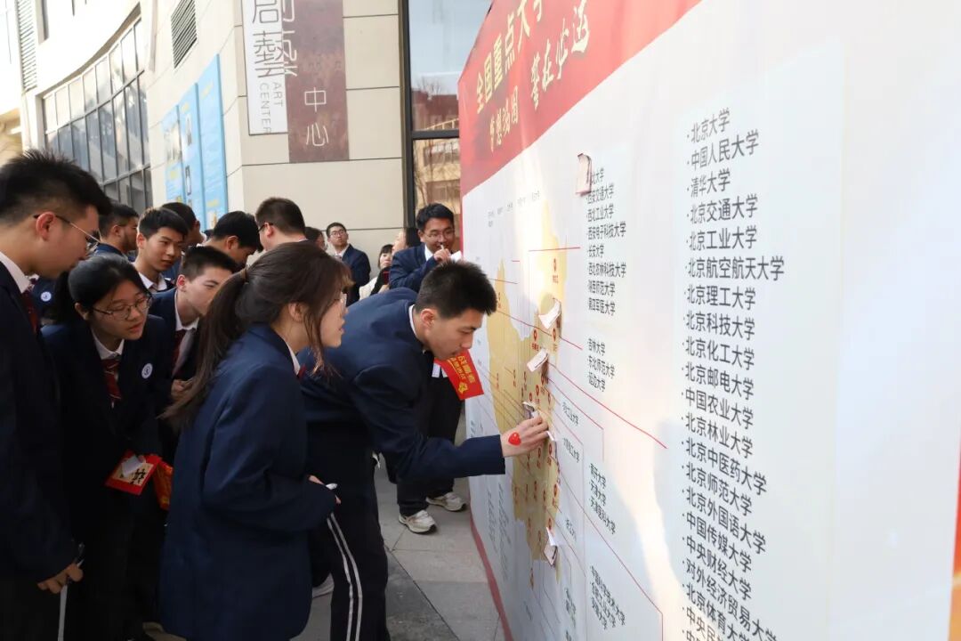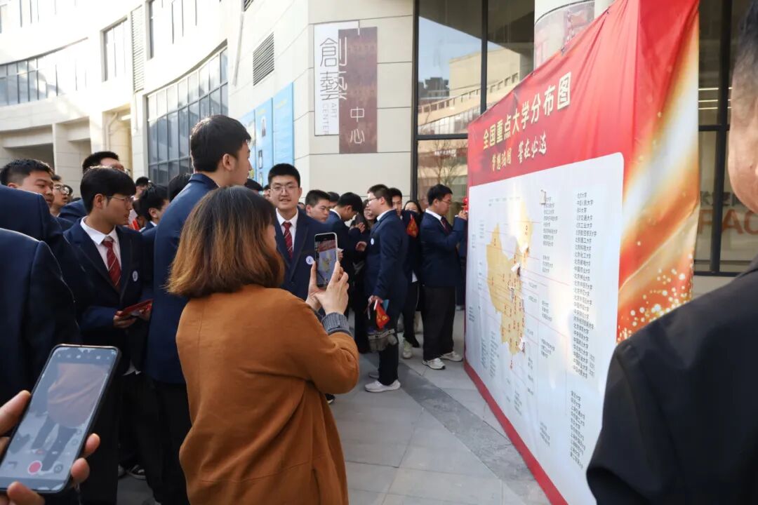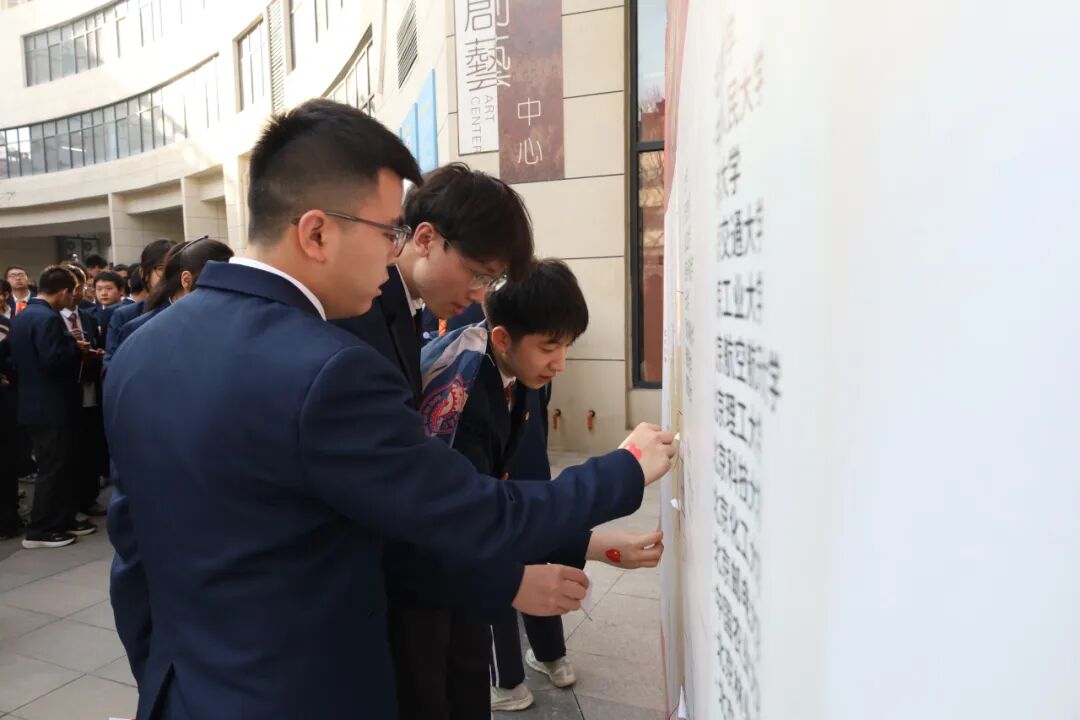 落笔为誓,心愿启航。在《拥抱太阳》的旋律中,各班同学有序来到报告厅门口领取“金榜题名”贴纸,共同写下未来的目标、彼此的承诺或鼓励。并小心翼翼地张贴在高考大学分布墙上。每一张贴纸,都是一份承诺;每一个名字,都是一个未来。