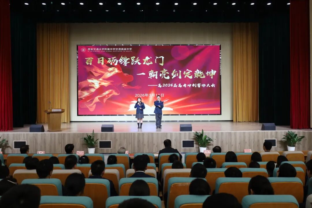 春风浩荡,万物竞发;战鼓声声,催人奋进。2026年高考倒计时已悄然开启,为鼓舞高三学子士气,点燃备考激情,3月11日下午,西安交大附中空港高级中学举行了“百日砺锋跃龙门 一朝亮剑定乾坤”高2026届高考冲刺誓师大会。学校领导、高三全体师生及家长齐聚一堂,共同为高2026届学子擂响出征的战鼓,见证这一庄严而热血的时刻。