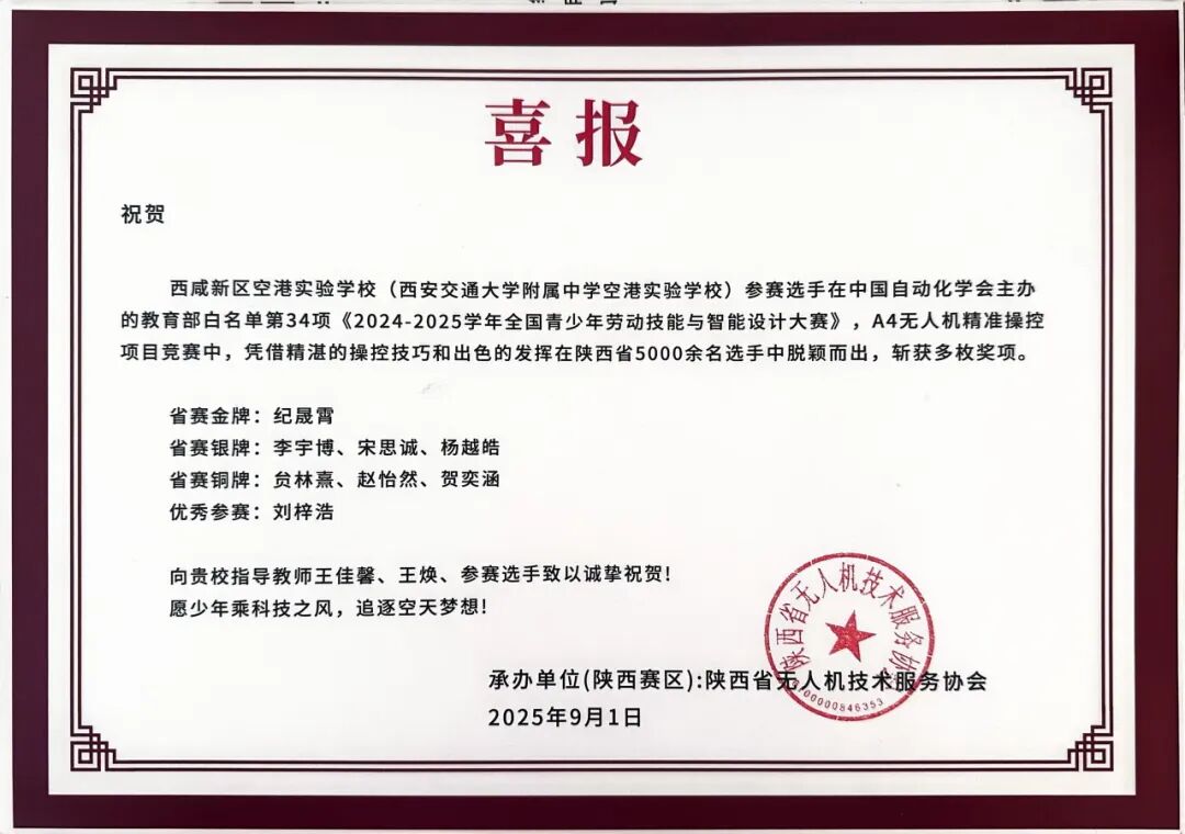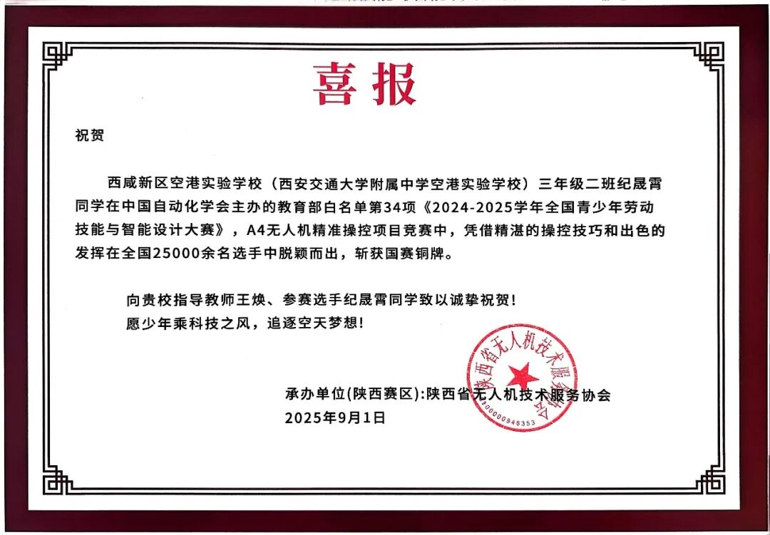 在由中国自动化学会与全国青少年劳动技能与智能设计大赛组委会联合主办的2024~2025学年全国青少年劳动技能与智能设计大赛中,西安交通大学附属中学学子于无人机精准操控项目中表现优异,充分展现了出色的劳动素养与智能设计能力。