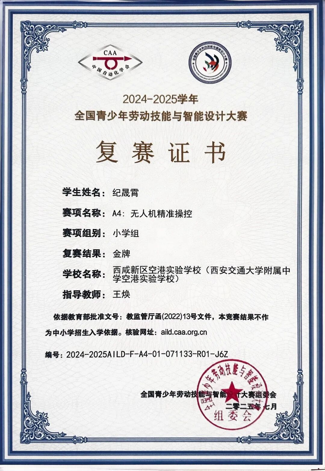 纪晟霄同学在2024~2025学年全国青少年劳动技能与智能设计大赛复赛中荣获A4:无人机精准操控小学组金牌,全国决赛铜牌。指导教师为王焕老师。