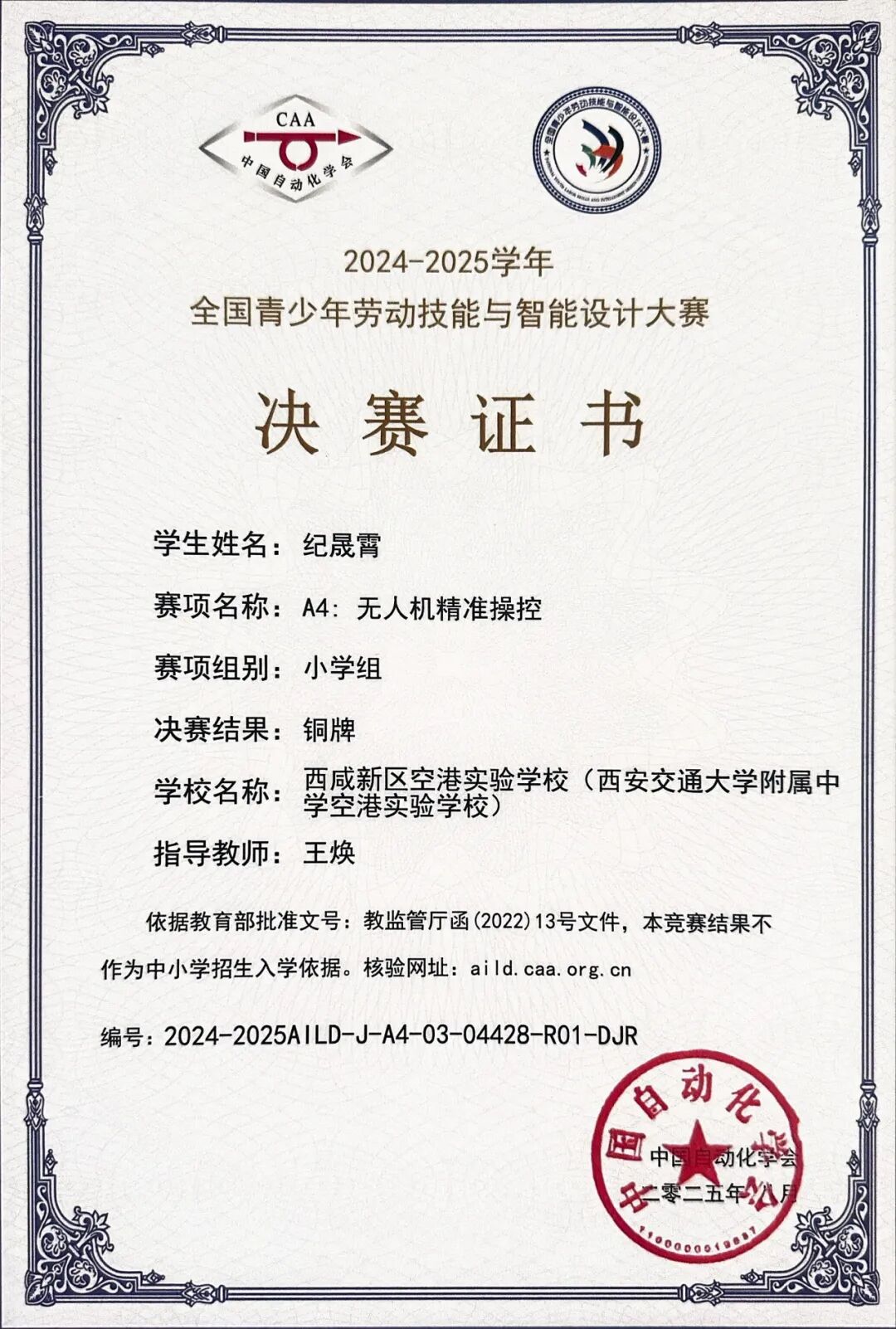 贺羿涵同学在2024~2025学年全国青少年劳动技能与智能设计大赛复赛中荣获A4:无人机精准操控小学组铜牌。指导教师为王焕老师。
