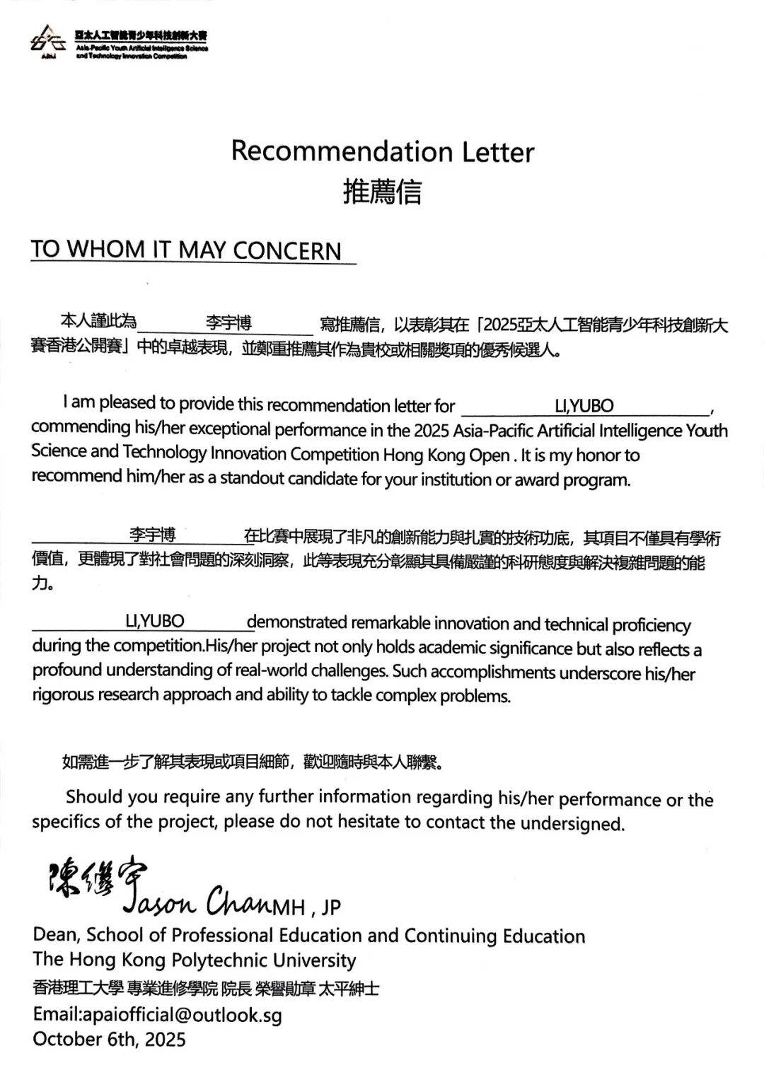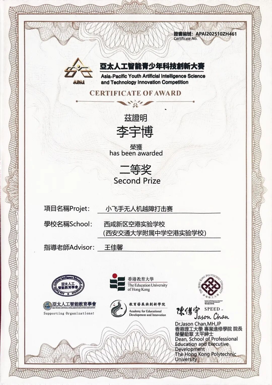 在2025APAI亚太人工智能青少年科技创新大赛中国区选拔赛(香港)中,西安交通大学附属中学李宇博同学表现优异,荣获“小飞手无人机越障打击赛”二等奖,同时,获得了亚太人工智能青少年科技创新大赛推荐信,展现了出色的综合能力与科技潜能。指导教师为王佳馨老师。