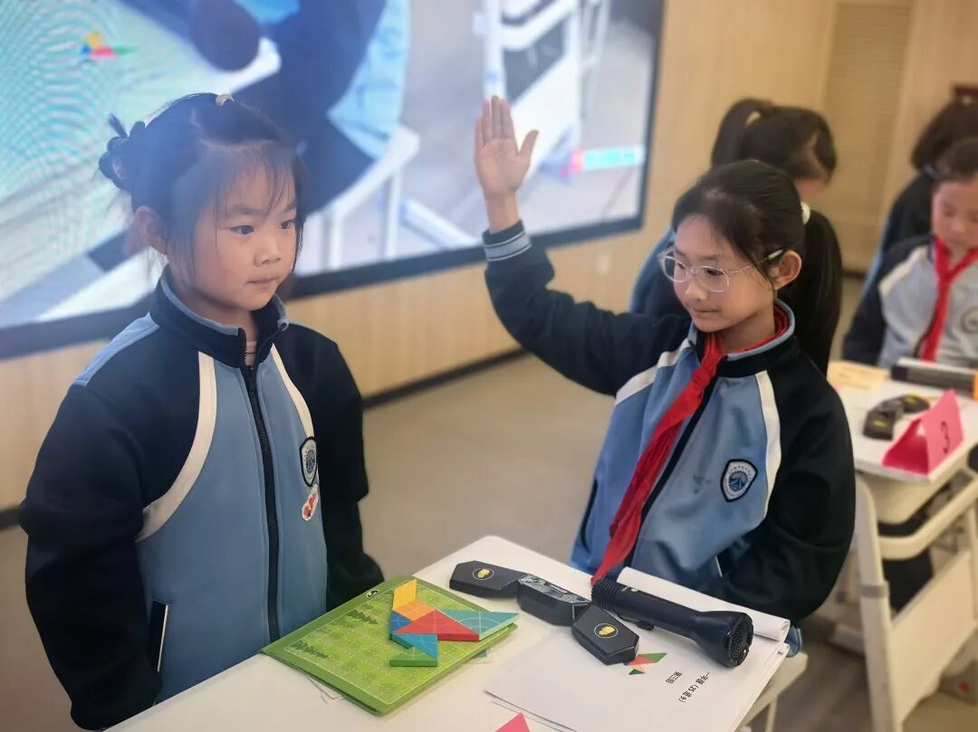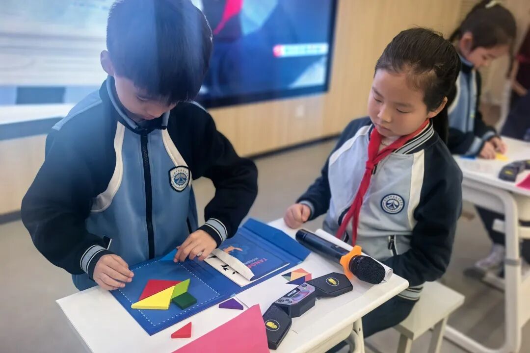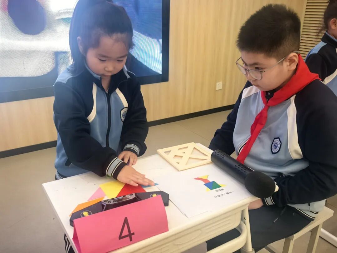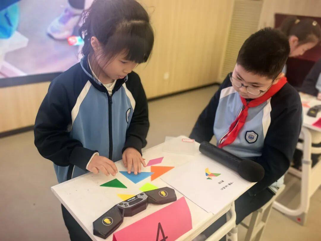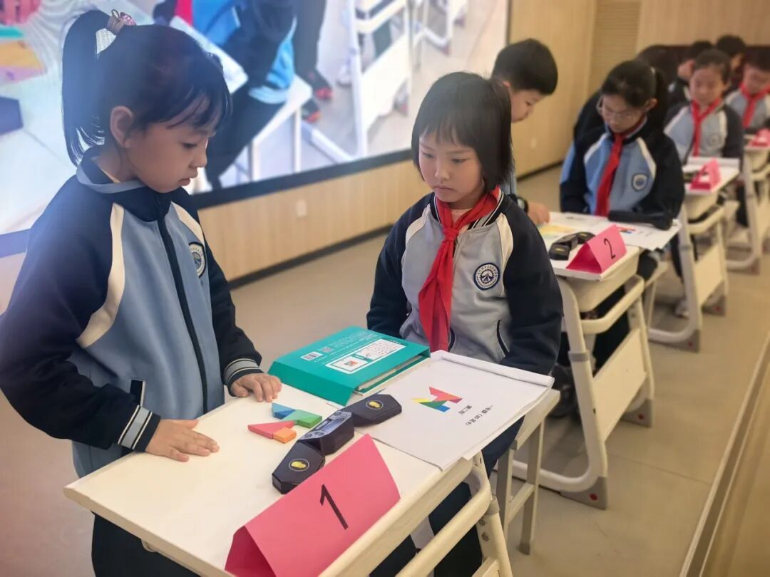 一年级萌宝们化身拼图达人,用七巧板快速拼出指定图形。彩色板子在孩子们手中翻转组合,瞬间化作灵动的动物、建筑与生活物品,充分锻炼了同学们的图形认知与空间想象力,让图形之美跃然眼前。